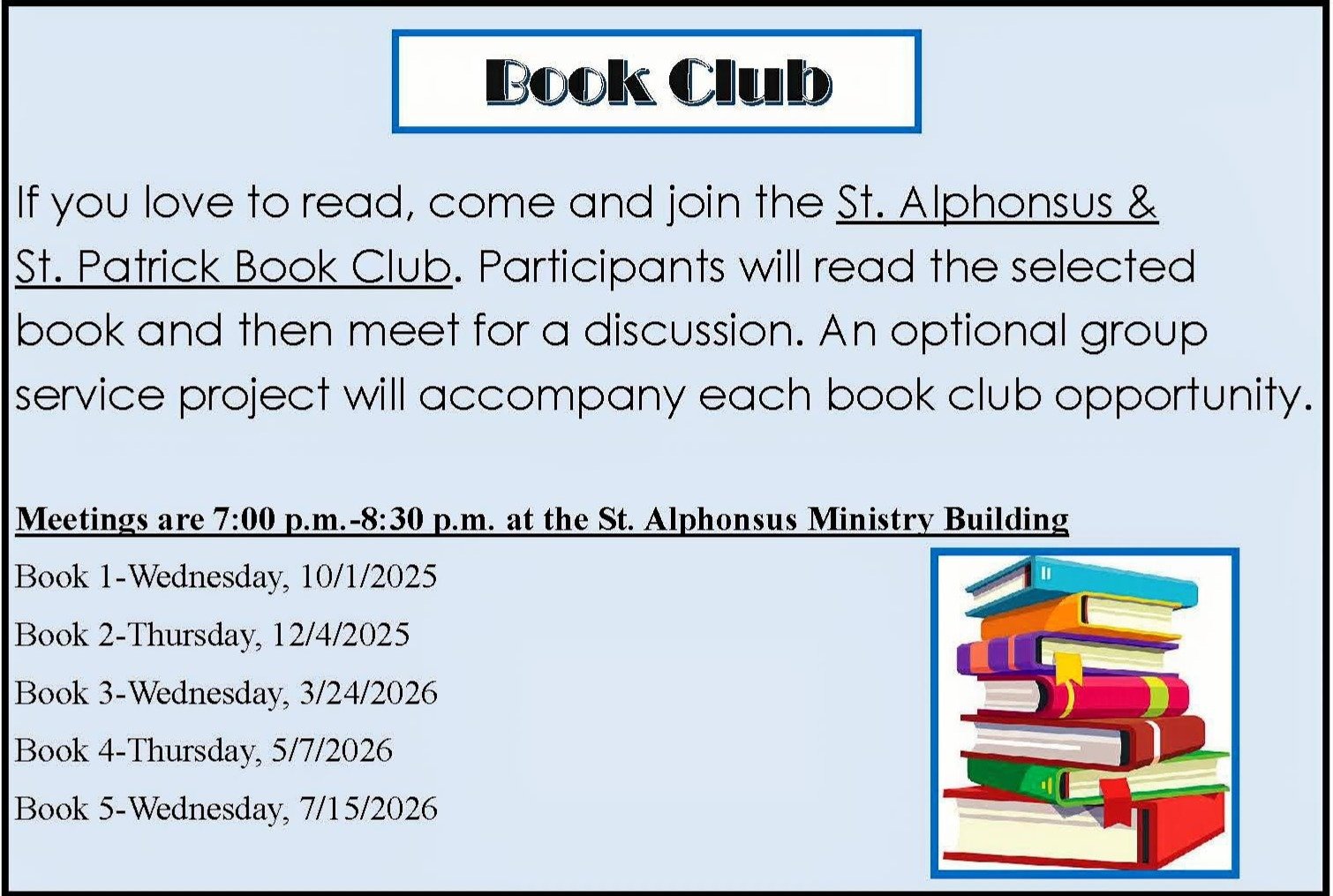Time: 6-8 p.m. at St. Patrick Ministry Building